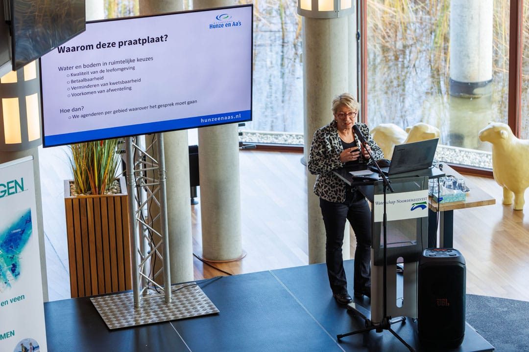 Vervolgens gaf Inge Eshuis (Dagelijks Bestuur, Waterschap Hunze en Aa’s) toelichting op de gezamenlijke praatplaat—een visueel instrument dat helpt om gebiedsgesprekken te structureren. Aan de hand van beelden, kaarten en themalagen werden de belangrijkste vraagstukken tastbaar.